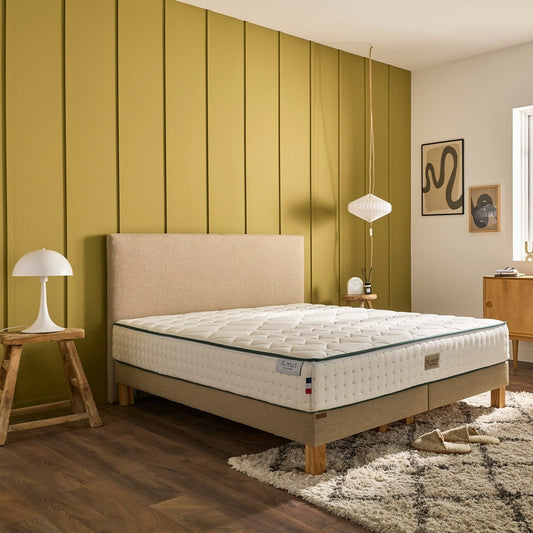 Son garnissage en laine et ouate recyclée régule la température pour un sommeil tempéré et une sensation cocooning.